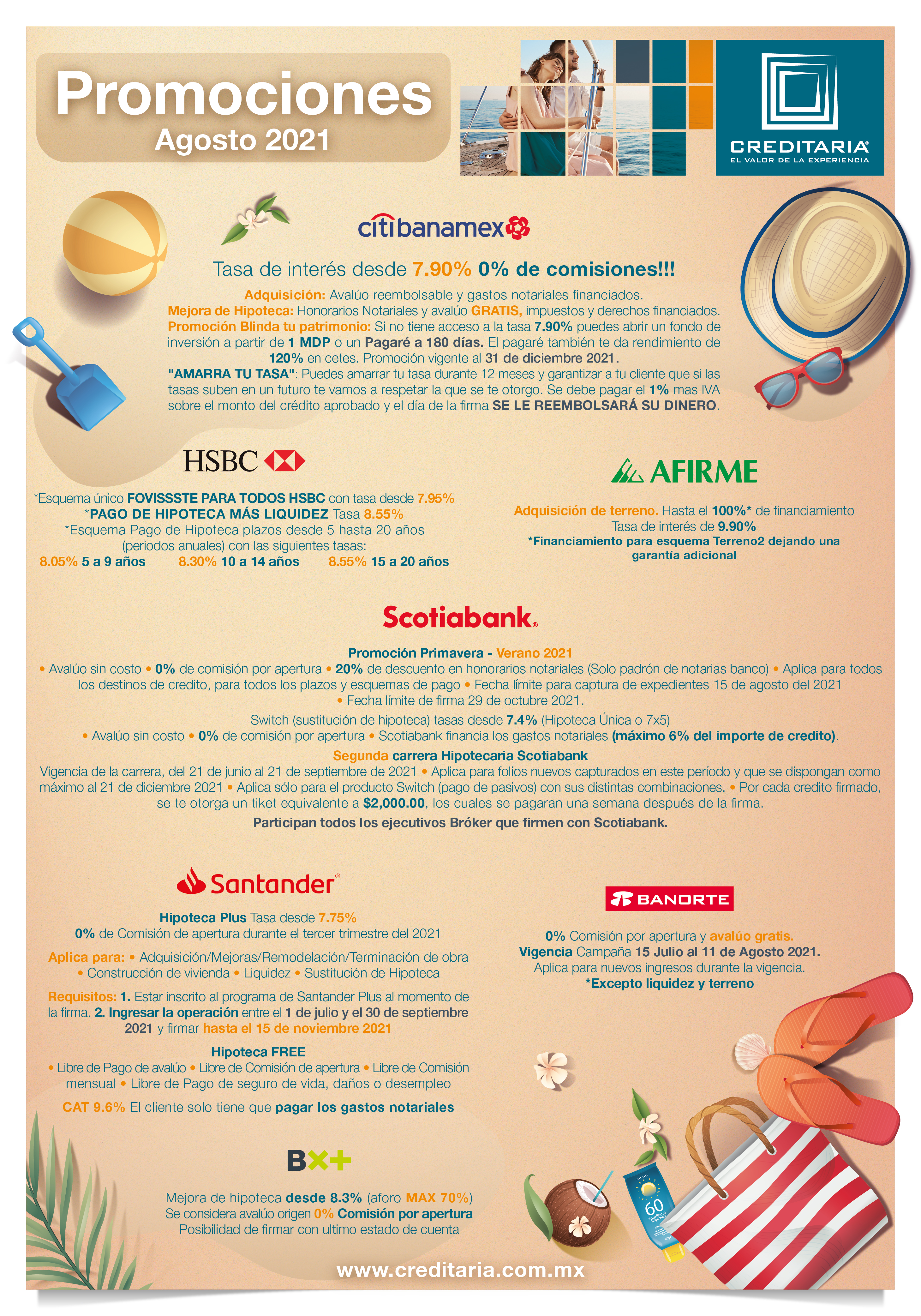Está por terminar el verano y si lo que estás buscando es comenzar a formar un patrimonio para ti y tu familia o remodelar, construir o sustituir tu hipoteca continúa leyendo este blog porque te contaremos las mejores promociones que los socios comerciales de Creditaria tienen para ti y tus seres queridos en cuanto a créditos hipotecarios se refiere.